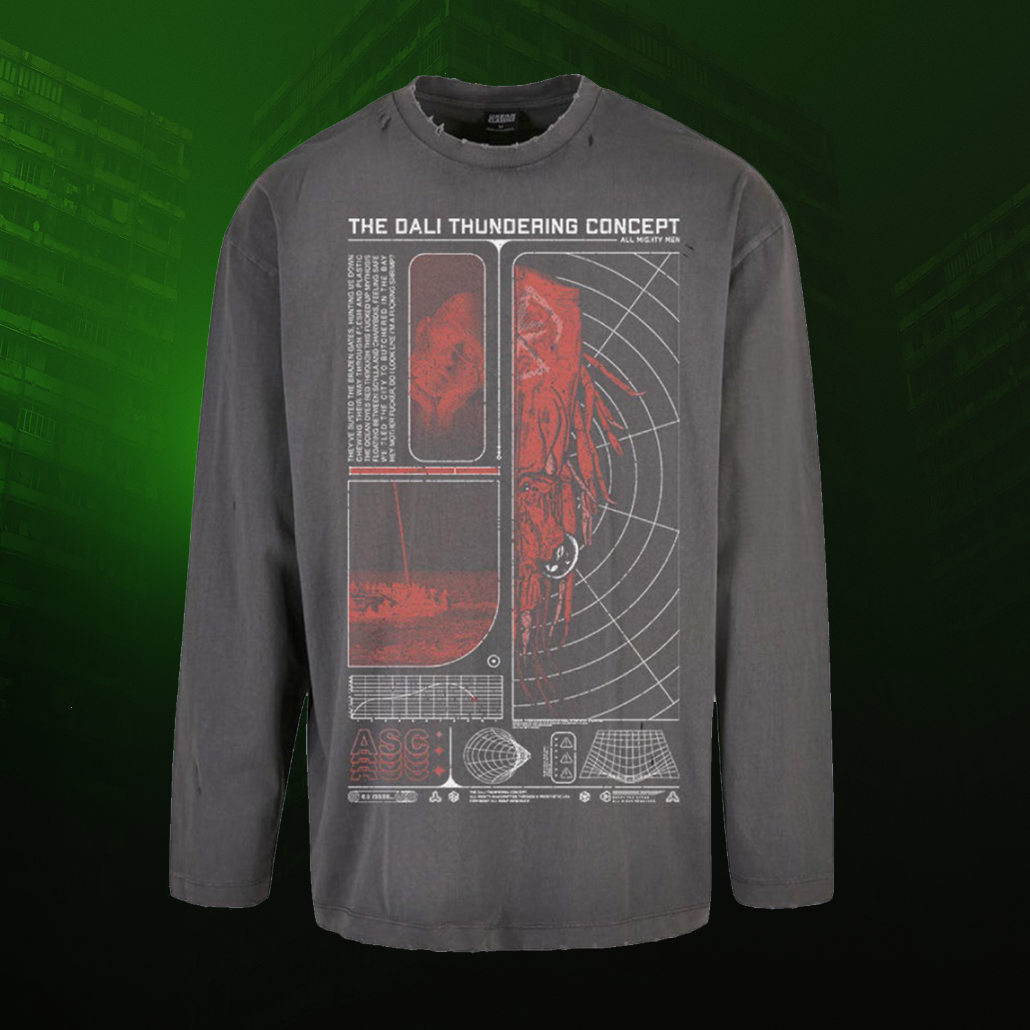 The 'Shrimp' design printed on a grey premium garment oversized longsleeve shirt.