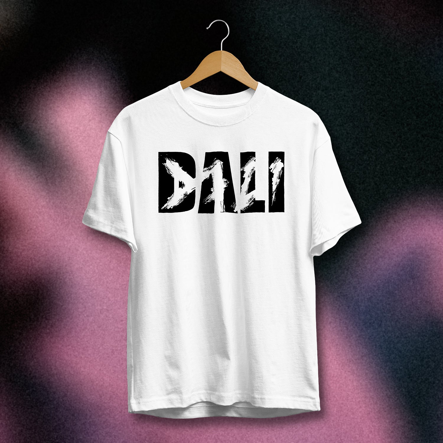 The 'DALI' design printed on a 100% recycled white premium garment t-shirt.