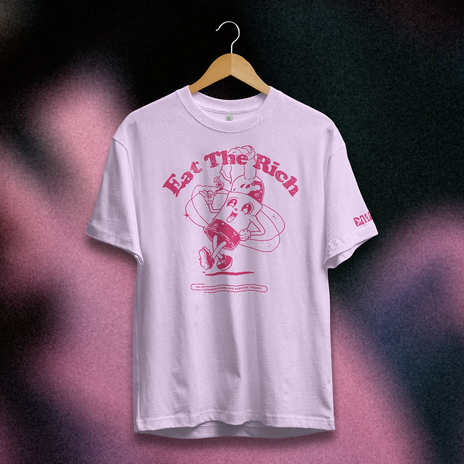 The 'EAT THE RICH' design printed on a pink premium garment t-shirt.